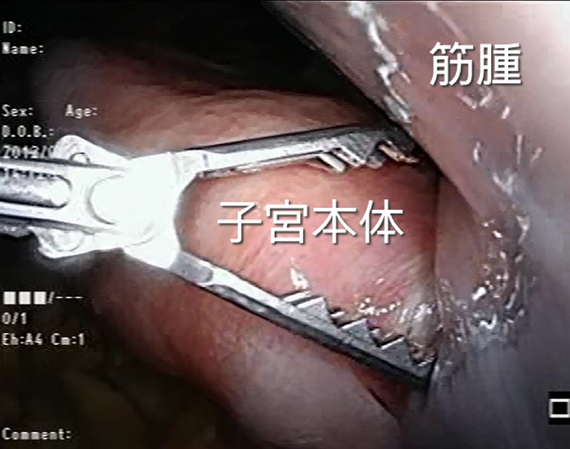 上の写真は、モニターに大きな子宮筋腫と両手で操作している鉗子の先端が映っています。