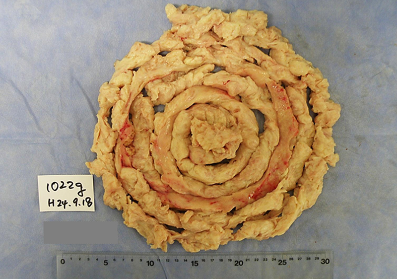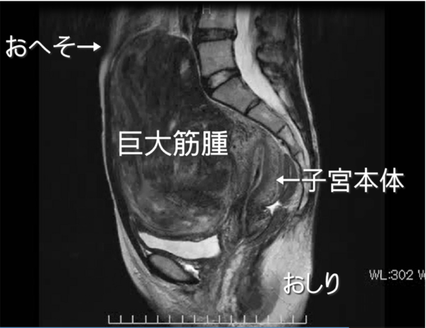 下のMRIは、下腹部を体の中心で縦割りにしたイメージです。巨大筋腫が偽閉経療法で小さくなり腹腔鏡で摘出できたケースです。17cmの巨大筋腫はおへそを超え、後に子宮が見えます。小さくなったとはいうものの摘出した筋腫は1022gありました。